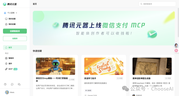 腾讯元器是腾讯推出的一个创作智能体的平台,在这上面,你可以创作各种各样的智能体,包括不限于微信公众号、学习效率等。而微信支付mcp就是针对智能体的支付服务。这里面的想象空间就大了。